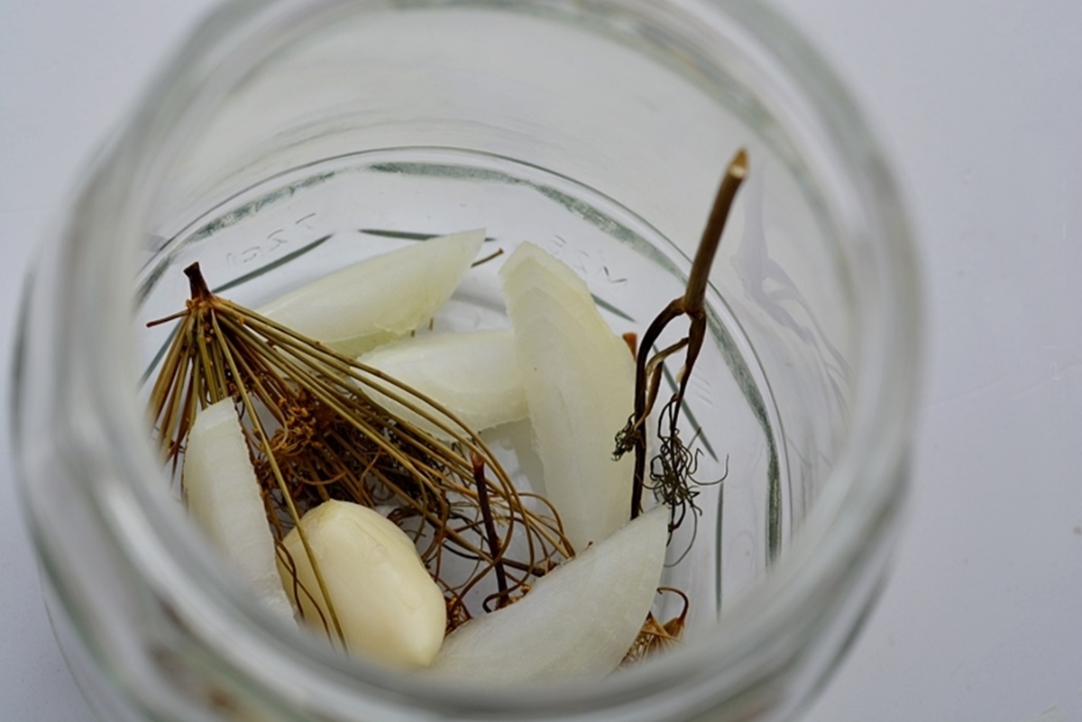 Pune la baza borcanelor 2-3 felii de ceapă, câte un cățel de usturoi tăiat în sferturi și câte o crenguță de mărar.