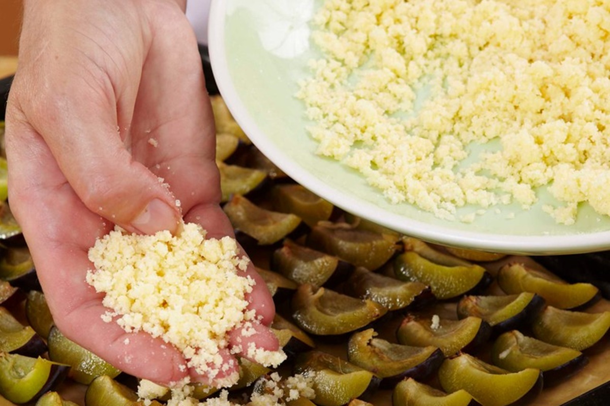 - Firimiturile pentru crumble se presară peste prunele aromatizate cu scorțișoară / Profimedia Images