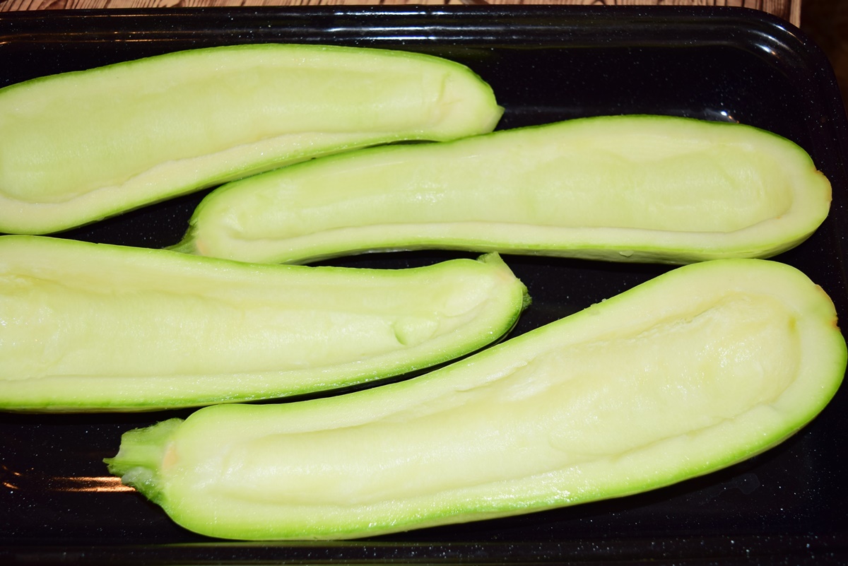 Spală bine dovleceii și taie-i în jumătăți, transversal. Trasează margini de 1 cm grosime cu vârful unui cuțit ascuțit. Apoi, cu o lingură, scobești interiorul jumătăților de dovlecei, urmărind marcajul pentru margini.